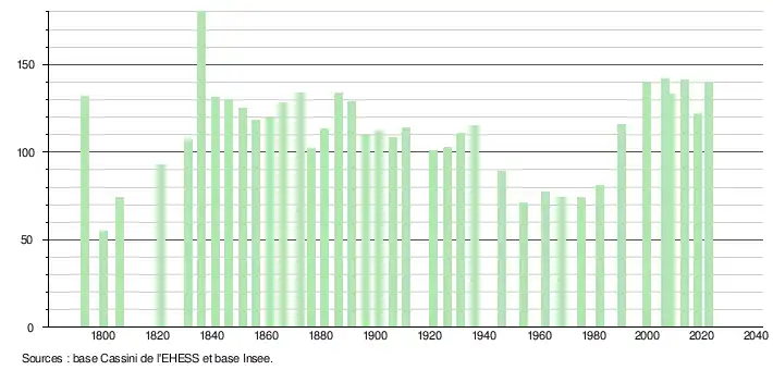 L'évolution du nombre d'habitants est connue à travers les recensements de la population effectués dans la commune depuis 1793. Pour les communes de moins de 10 000 habitants, une enquête de recensement portant sur toute la population est réalisée tous les cinq ans, les populations de référence des années intermédiaires étant quant à elles estimées par interpolation ou extrapolation[32]. Pour la commune, le premier recensement exhaustif entrant dans le cadre du nouveau dispositif a été réalisé en 2008[33].