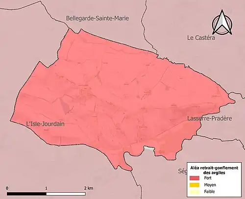 Le retrait-gonflement des sols argileux est susceptible d'engendrer des dommages importants aux bâtiments en cas d’alternance de périodes de sécheresse et de pluie. La totalité de la commune est en aléa moyen ou fort (88,8 % au niveau départemental et 48,5 % au niveau national). Sur les 119 bâtiments dénombrés sur la commune en 2019, 119 sont en aléa moyen ou fort, soit 100 %, à comparer aux 98 % au niveau départemental et 54 % au niveau national. Une cartographie de l'exposition du territoire national au retrait gonflement des sols argileux est disponible sur le site du BRGM[20],[Carte 3].