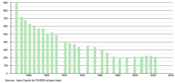 L'évolution du nombre d'habitants est connue à travers les recensements de la population effectués dans la commune depuis 1866. Pour les communes de moins de 10 000 habitants, une enquête de recensement portant sur toute la population est réalisée tous les cinq ans, les populations de référence des années intermédiaires étant quant à elles estimées par interpolation ou extrapolation[27]. Pour la commune, le premier recensement exhaustif entrant dans le cadre du nouveau dispositif a été réalisé en 2007[28].