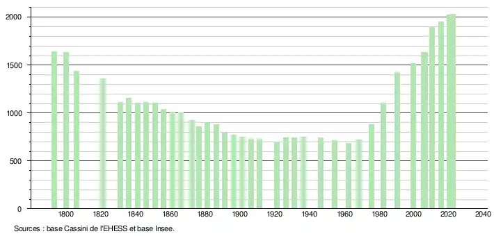 L'évolution du nombre d'habitants est connue à travers les recensements de la population effectués dans la commune depuis 1793. Pour les communes de moins de 10 000 habitants, une enquête de recensement portant sur toute la population est réalisée tous les cinq ans, les populations de référence des années intermédiaires étant quant à elles estimées par interpolation ou extrapolation[26]. Pour la commune, le premier recensement exhaustif entrant dans le cadre du nouveau dispositif a été réalisé en 2005[27].