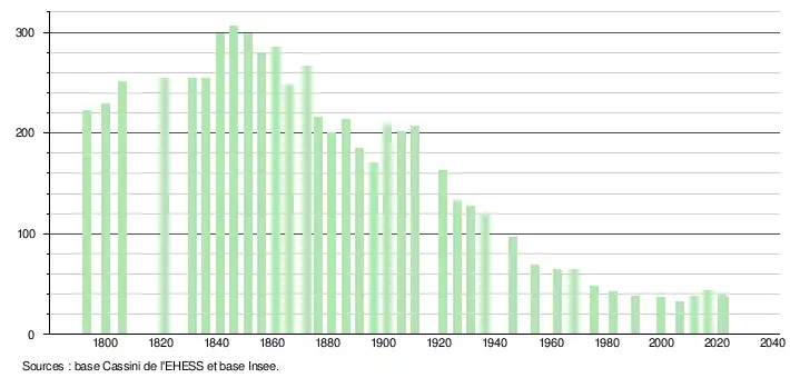L'évolution du nombre d'habitants est connue à travers les recensements de la population effectués dans la commune depuis 1793. Pour les communes de moins de 10 000 habitants, une enquête de recensement portant sur toute la population est réalisée tous les cinq ans, les populations de référence des années intermédiaires étant quant à elles estimées par interpolation ou extrapolation[20]. Pour la commune, le premier recensement exhaustif entrant dans le cadre du nouveau dispositif a été réalisé en 2006[21].