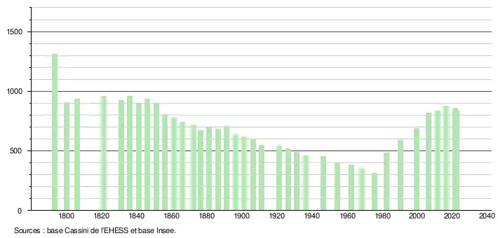 L'évolution du nombre d'habitants est connue à travers les recensements de la population effectués dans la commune depuis 1793. Pour les communes de moins de 10 000 habitants, une enquête de recensement portant sur toute la population est réalisée tous les cinq ans, les populations de référence des années intermédiaires étant quant à elles estimées par interpolation ou extrapolation[32]. Pour la commune, le premier recensement exhaustif entrant dans le cadre du nouveau dispositif a été réalisé en 2006[33].