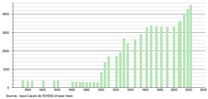 L'évolution du nombre d'habitants est connue à travers les recensements de la population effectués dans la commune depuis 1793. Pour les communes de moins de 10 000 habitants, une enquête de recensement portant sur toute la population est réalisée tous les cinq ans, les populations de référence des années intermédiaires étant quant à elles estimées par interpolation ou extrapolation[19]. Pour la commune, le premier recensement exhaustif entrant dans le cadre du nouveau dispositif a été réalisé en 2008[20].