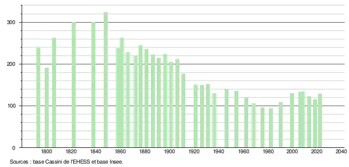 L'évolution du nombre d'habitants est connue à travers les recensements de la population effectués dans la commune depuis 1793. Pour les communes de moins de 10 000 habitants, une enquête de recensement portant sur toute la population est réalisée tous les cinq ans, les populations de référence des années intermédiaires étant quant à elles estimées par interpolation ou extrapolation[10]. Pour la commune, le premier recensement exhaustif entrant dans le cadre du nouveau dispositif a été réalisé en 2008[11].