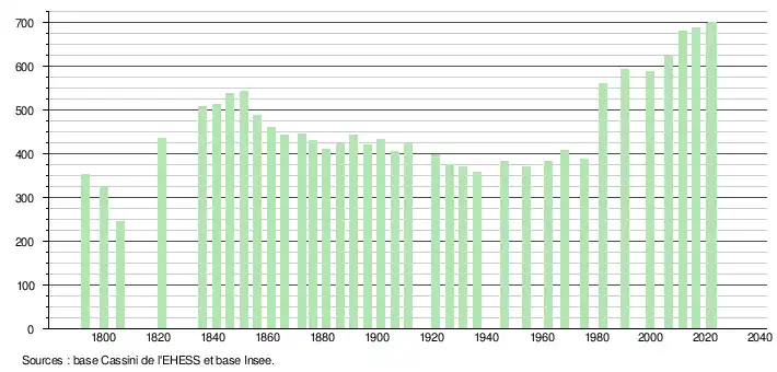 L'évolution du nombre d'habitants est connue à travers les recensements de la population effectués dans la commune depuis 1793. Pour les communes de moins de 10 000 habitants, une enquête de recensement portant sur toute la population est réalisée tous les cinq ans, les populations de référence des années intermédiaires étant quant à elles estimées par interpolation ou extrapolation[14]. Pour la commune, le premier recensement exhaustif entrant dans le cadre du nouveau dispositif a été réalisé en 2006[15].