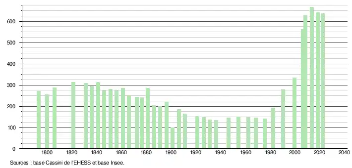 L'évolution du nombre d'habitants est connue à travers les recensements de la population effectués dans la commune depuis 1793. Pour les communes de moins de 10 000 habitants, une enquête de recensement portant sur toute la population est réalisée tous les cinq ans, les populations de référence des années intermédiaires étant quant à elles estimées par interpolation ou extrapolation[25]. Pour la commune, le premier recensement exhaustif entrant dans le cadre du nouveau dispositif a été réalisé en 2008[26].