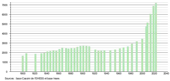 L'évolution du nombre d'habitants est connue à travers les recensements de la population effectués dans la commune depuis 1800. Pour les communes de moins de 10 000 habitants, une enquête de recensement portant sur toute la population est réalisée tous les cinq ans, les populations de référence des années intermédiaires étant quant à elles estimées par interpolation ou extrapolation[22]. Pour la commune, le premier recensement exhaustif entrant dans le cadre du nouveau dispositif a été réalisé en 2008[23].