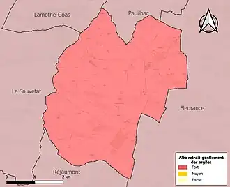 Le retrait-gonflement des sols argileux est susceptible d'engendrer des dommages importants aux bâtiments en cas d’alternance de périodes de sécheresse et de pluie. La totalité de la commune est en aléa moyen ou fort (94,5 % au niveau départemental et 48,5 % au niveau national). Sur les 82 bâtiments dénombrés sur la commune en 2019, 82 sont en aléa moyen ou fort, soit 100 %, à comparer aux 93 % au niveau départemental et 54 % au niveau national. Une cartographie de l'exposition du territoire national au retrait gonflement des sols argileux est disponible sur le site du BRGM[18],[Carte 3].