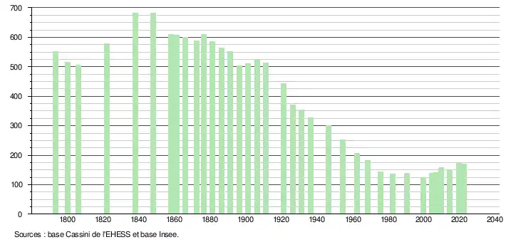 L'évolution du nombre d'habitants est connue à travers les recensements de la population effectués dans la commune depuis 1793. Pour les communes de moins de 10 000 habitants, une enquête de recensement portant sur toute la population est réalisée tous les cinq ans, les populations de référence des années intermédiaires étant quant à elles estimées par interpolation ou extrapolation[7]. Pour la commune, le premier recensement exhaustif entrant dans le cadre du nouveau dispositif a été réalisé en 2004[8].