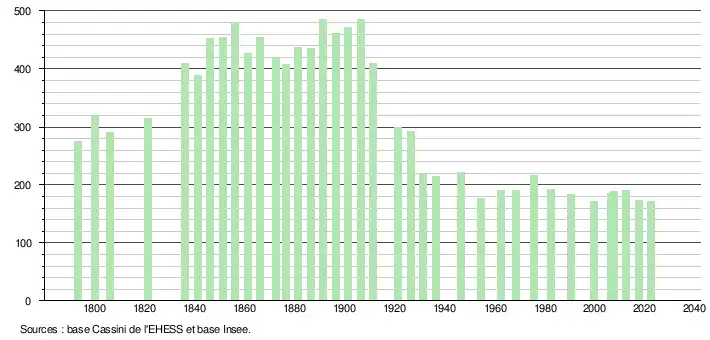 L'évolution du nombre d'habitants est connue à travers les recensements de la population effectués dans la commune depuis 1793. Pour les communes de moins de 10 000 habitants, une enquête de recensement portant sur toute la population est réalisée tous les cinq ans, les populations de référence des années intermédiaires étant quant à elles estimées par interpolation ou extrapolation[21]. Pour la commune, le premier recensement exhaustif entrant dans le cadre du nouveau dispositif a été réalisé en 2007[22].