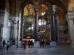 Lors de la conversion de Sainte-Sophie en musée en , ces panneaux auraient dû être retirés mais n'ont pu l'être car ils ne passaient pas les portes[61]. Ils ont donc été simplement décrochés et exposés dans le musée. Ils ont été à nouveau accrochés en , pour le 500e anniversaire de la prise de Constantinople par les Ottomans et la conversion de la basilique en mosquée.