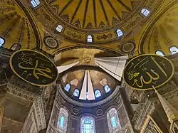 Avant , des panneaux similaires existaient déjà dans l'édifice, installés lors de sa restauration en 1847-1849 par le sultan Abdülmecid, sous la direction des frères Gaspare et Giuseppe Fossati. Mais ces panneaux originaux étaient rectangulaires, plus petits, et n'étaient qu'au nombre de six, Hassan et Hussein n'étant pas encore inclus[59]. Le choix de ces huit noms, que l'on retrouve à cette époque dans un grand nombre de commandes ottomanes, en particulier architecturales, est le signe des ambitions panislamiques de cet empire sunnite, les deux derniers noms (Hassan et Hussein) étant destinés à faire écho dans le monde chiite[59]. C'est ainsi qu'on trouve dès 1851 des panneaux semblables à ceux installés à Sainte-Sophie en , portant les mêmes huit noms, en plus petits, dans la mosquée Hırka-i Şerif (en) à Istanbul ; ils y sont calligraphiés par le sultan Abdülmecid en personne, qui a fait construire cette mosquée pour abriter un manteau du prophète[59],[60]. On retrouve le motif de ces panneaux jusqu'au début du XXe siècle dans le wagon-mosquée du chemin de fer du Hedjaz, où la calligraphie est presque identique à ceux de Sainte-Sophie[59].