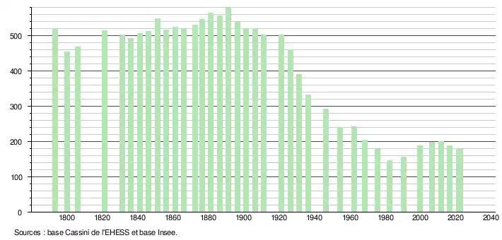 L'évolution du nombre d'habitants est connue à travers les recensements de la population effectués dans la commune depuis 1793. Pour les communes de moins de 10 000 habitants, une enquête de recensement portant sur toute la population est réalisée tous les cinq ans, les populations de référence des années intermédiaires étant quant à elles estimées par interpolation ou extrapolation[17]. Pour la commune, le premier recensement exhaustif entrant dans le cadre du nouveau dispositif a été réalisé en 2006[18].