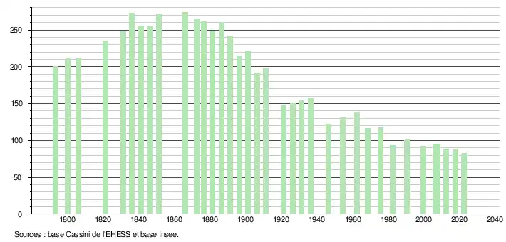 L'évolution du nombre d'habitants est connue à travers les recensements de la population effectués dans la commune depuis 1793. Pour les communes de moins de 10 000 habitants, une enquête de recensement portant sur toute la population est réalisée tous les cinq ans, les populations de référence des années intermédiaires étant quant à elles estimées par interpolation ou extrapolation[19]. Pour la commune, le premier recensement exhaustif entrant dans le cadre du nouveau dispositif a été réalisé en 2007[20].