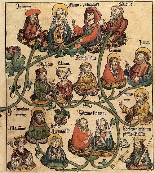 | Ismérie | Stolanus ou Solanus(?)[3] Ephraim(?)[4] | Joachim | Anne | Cléophas | Salomas | ||||||||||||||||||||||||||||||||||||||||||||||||||||||||||||||||||||||||||||||||||||||||||