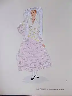 En 1835, hommes et femmes portent encore la « cape », espèce de petit manteau à capuchon si célèbre chez les Romains sous le nom de bardo-cucullus ou cucullus santonicus. Ce vêtement commode, qui avait été adopté par plusieurs autres peuples de la Gaule, se retrouve encore chez les habitants des Landes à l'époque[2]. À la fin des années 1860, les hommes saintongeais empruntent souvent à leurs femmes la « cape » ou « cucule » qui est saintongeaise de toute antiquité. Ils portent aussi la chaussure en bois de leurs ancêtres, la « galoche » (gallica) et encore quelque peu le grand chapeau analogue au sombrero des Espagnols[3]. Pour ce qui est de la ganse en chenille multicolore, du vieil habit à la Henri IV, du hauts-de-chausses à jarretières rouges et à gabillots au lieu de boutons, ils ont totalement disparu en 1869[3].