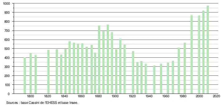 - ↑ Par convention dans Wikipédia, le principe a été retenu de n’afficher dans le tableau des recensements et le graphique, pour les populations légales postérieures à 1999, que les populations correspondant à une enquête exhaustive de recensement pour les communes de moins de 10 000 habitants, et que les populations des années 2006, 2011, 2016, etc. pour les communes de plus de 10 000 habitants, ainsi que la dernière population légale publiée par l’Insee pour l'ensemble des communes.