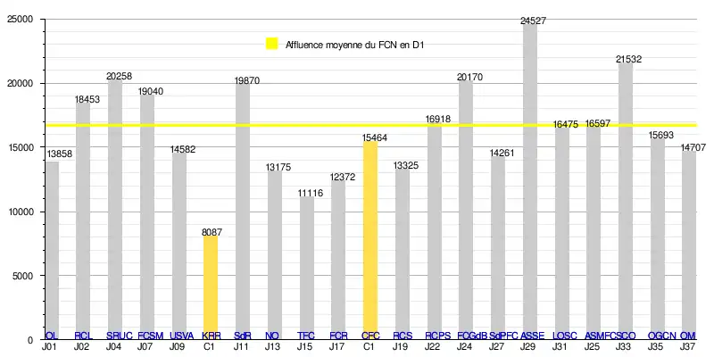 L'affluence à domicile du FC Nantes atteint un total de 316 928 spectateurs en 19 rencontres de Division 1, soit une moyenne de 16 680/match.