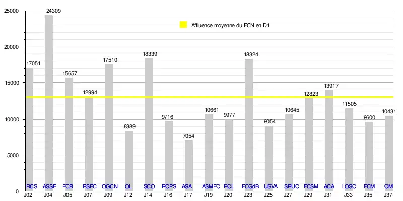 L'affluence à domicile du FC Nantes atteint un total de 247 956 spectateurs en 19 rencontres de Division 1, soit une moyenne de 13 050/match.