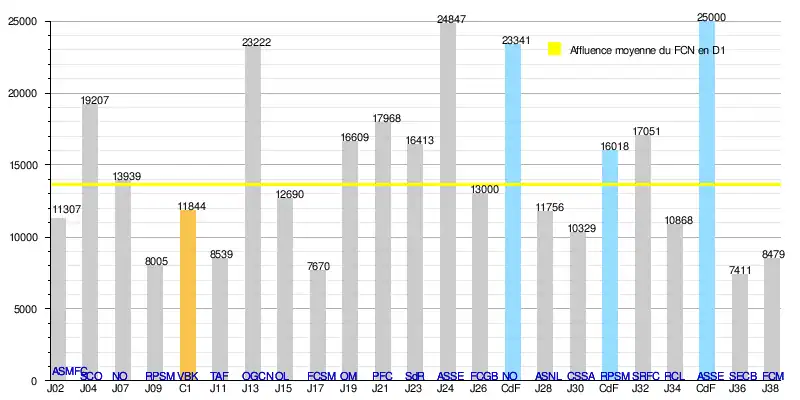 - de 259 310 spectateurs en 19 rencontres de Division 1, soit une moyenne de 13 648/match.