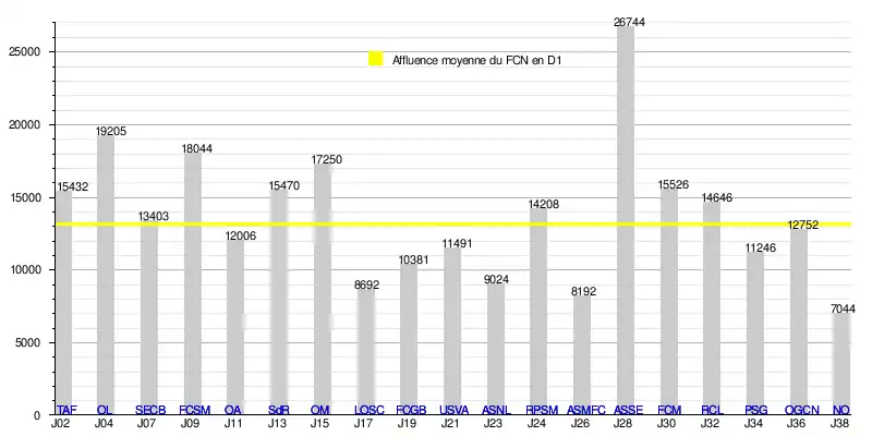 L'affluence à domicile du FC Nantes atteint un total de 249 510 spectateurs en 19 rencontres de Division 1, soit une moyenne de 13 132/match.