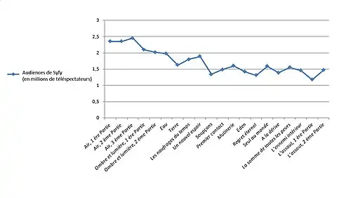 La série affiche une audience moyenne de 1,717 million de téléspectateurs sur la chaîne américaine Syfy, cependant elles ont diminué lors de la seconde moitié de la saison qui a été diffusée plus de 5 mois après la première moitié. C'est d'ailleurs en se basant sur les bonnes audiences de la première moitié de la saison que la MGM avait décidé en de renouveler la série pour une seconde saison[1].