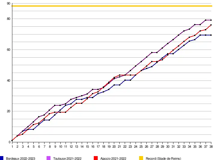 | Ligue 2 | 38 | 20 | 9 | 9 | 51 | 28 | + 23 |