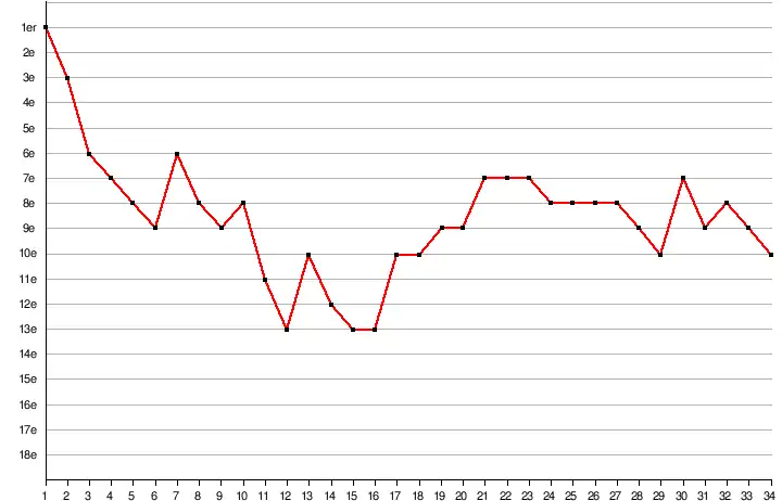 10e 46 points (12V, 10N, 12D) 53 buts pour, 46 buts contre |