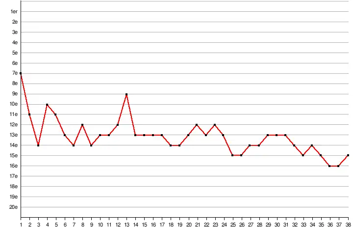 15e 42 points (11V, 9N, 18D) 44 buts pour, 54 buts contre |