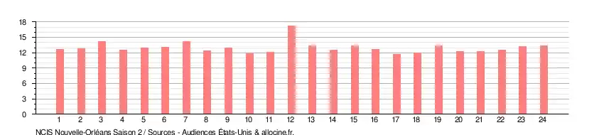 - ↑ Pour le calcul des épisodes 13x02 de NCIS et 2x12 de NCIS : Nouvelle-Orléans, les deux épisodes ont été calculés ensemble comme étant un seul épisode d'une durée de deux heures.