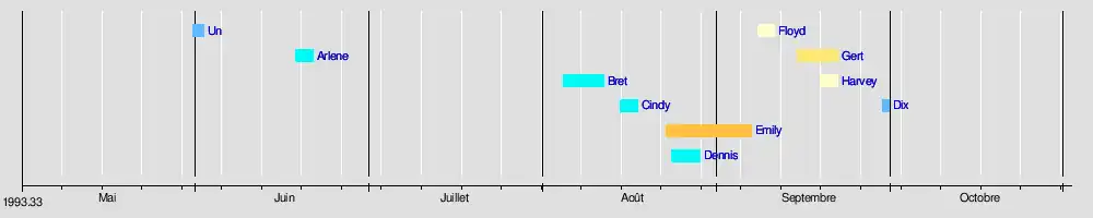 La saison des ouragans dans l'Atlantique a commencé officiellement le , mais l'activité cyclonique a commencé un jour plus tôt avec le développement de la dépression tropicale Un le 31 mai[7]. Cependant, au cours des deux mois suivants, l'activité est restée minimale, avec une seule tempête nommée (Arlene) en juin. Août est le mois le plus actif, avec quatre systèmes en développement : les tempêtes tropicales Bret, Cindy et Dennis, ainsi que l'ouragan Emily[8]. Septembre, normalement le pic climatologique de la saison des ouragans[9], n'a vu se former que trois tempêtes nommées : les ouragans Floyd, Gert et Harvey[8]. Le dernier système de 1993, la dépression tropicale Dix, est devienu extratropical le 30 septembre, deux mois avant la fin officielle de la saison le 30 novembre[7],[10].