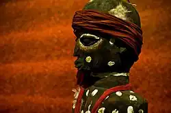 - une statuette féminine en bois (avant 1880[9]), représente une adepte agenouillée qui tient sur sa tête une coupe destinée aux offrandes ; sa peau est peinte de points blancs évoquant la variole [10].
