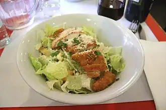 La salade César (en anglais : Caesar salad ; en espagnol : ensalada César ; en italien : Caesar salad) est une recette de cuisine de salade composée de la cuisine américaine[4] créée en 1924 par le chef cuisinier italo-américain Caesar Cardini dans son restaurant Caesar's de Tijuana au Mexique[a],[1],[2],[3], la salade César devient une des recettes populaires de la cuisine des États-Unis et de la restauration rapide, puis du monde entier[5]. Il s'agit d'une association d'ingrédients à base de salade, d'œufs, de croûtons et de morceaux de poulet[6].