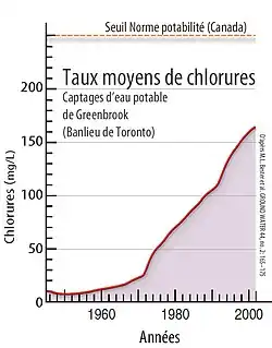 Au début des années 2000, dans ce bassin urbain, où les ouvrages souterrains ont pu modifier les systèmes et vitesse d'infiltration de l'eau[17], le taux annuel de rétention de sels de déglaçage a été calculé via le bilan de masse des chlorures entrant et sortant du bassin (urbain) de la rivière Highland (104 km2, considéré comme bassin versant urbain typique de l'Est de la métropole de Toronto). La contribution de ce bassin à la recharge des eaux souterraines a été estimé à 162 mm d'eau par an. Les registres municipaux indiquent le rejet dans l'environnement de ce bassin versant d'environ 10 000 t/an de sel (NaCl essentiellement), soit un dixième environ des apports de toute l'agglomération). Les chercheurs ont suivi le débit et la conductivité électrique de la rivière toutes les 15 minutes durant deux ans. Le calcul du solde a montré que seuls 45 % du sel épandu sur le bassin versant a été lessivé par les pluies. Le reste a pénétré le sol. Si le salage est maintenu avec de telles quantités de sel, les taux moyens de chlorure vont encore augmenter pour atteindre « peut-être dans un délai de 20 ans » un seuil inacceptable pour l'environnement et la potabilité de l'eau, avec 426 ± 50 mg/L. La valeur de 426 mg/L est presque le double du seuil acceptable pour la qualité de l'eau au Canada (250 mg/L)[5]. Ce sel est un des contaminants routiers apportés aux grands lacs, dont le proche lac Ontario[19]. - Dans la région torontaise toujours, les nombreuses données hydrogéologiques disponibles suggèrent que les chlorures d'origine naturelle comptent pour une faible part dans l'enrichissement des nappes (Le fond géochimique se situe entre 15 et 20 mg/L). Or, ces niveaux sont dépassés dans plus de 50 % des puits autour de Toronto. Les sources potentielles de sel sont principalement les sels de voirie, certains lixiviats de décharge, certains engrais agricoles et les eaux salines du substratum rocheux. La plupart de ces sources libèrent du sel chimiquement pur avec 2 ou 3 ions majeurs. Une traçabilité précise des origines est difficile, bien que les iodures et fluorures permettent de remonter à certaines sources. L'iodure permet notamment de différencier la plupart des sels de voirie de ceux provenant d'eaux salines naturellement formées dans le substratum rocheux[20].