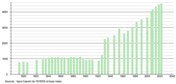 L'évolution du nombre d'habitants est connue à travers les recensements de la population effectués dans la commune depuis 1793. Pour les communes de moins de 10 000 habitants, une enquête de recensement portant sur toute la population est réalisée tous les cinq ans, les populations de référence des années intermédiaires étant quant à elles estimées par interpolation ou extrapolation[17]. Pour la commune, le premier recensement exhaustif entrant dans le cadre du nouveau dispositif a été réalisé en 2008[18].