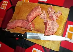 Le tout est ensuite ensaché dans un boyau de porc et enfin laissé reposer pendant une journée avant consommation[4] La production se fait pendant la saison froide, en principe entre septembre et avril[1].