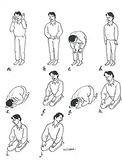 Chacune des cinq prières est divisée en deux ou trois ou quatre unités appelées rak'a (pluriel : rakat). Chacun de ces cycles est lui-même constitué au moins de la récitation de la sourate Al-Fatiha, d'une louange divine, d’invocations, le tout dans une suite spécifique de postures : debout, incliné, prosterné, à genoux[5]. A la fin de chaque prière, le musulman dit deux fois, tournant son visage vers les personnes à sa droite puis à sa gauche : « Que la paix et la miséricorde de Dieu soient sur vous » (en arabe : السلام عليكم ورحمة الله (as-salam alay- kum wa-raḥmatu-l-lah)[20]. Cette formule est appelée taslim (salutation).