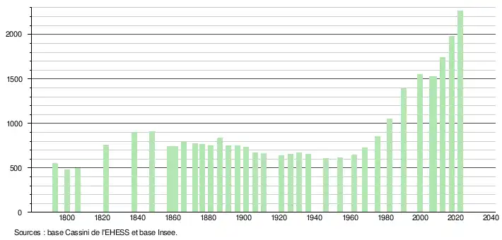 L'évolution du nombre d'habitants est connue à travers les recensements de la population effectués dans la commune depuis 1793. Pour les communes de moins de 10 000 habitants, une enquête de recensement portant sur toute la population est réalisée tous les cinq ans, les populations de référence des années intermédiaires étant quant à elles estimées par interpolation ou extrapolation[16]. Pour la commune, le premier recensement exhaustif entrant dans le cadre du nouveau dispositif a été réalisé en 2007[17].