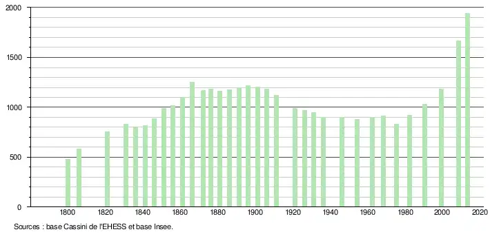 L'évolution du nombre d'habitants est connue à travers les recensements de la population effectués dans la commune depuis 1800. À partir du , les populations légales des communes sont publiées annuellement dans le cadre d'un recensement qui repose désormais sur une collecte d'information annuelle, concernant successivement tous les territoires communaux au cours d'une période de cinq ans. Pour les communes de moins de 10 000 habitants, une enquête de recensement portant sur toute la population est réalisée tous les cinq ans, les populations légales des années intermédiaires étant quant à elles estimées par interpolation ou extrapolation[8]. Pour la commune, le premier recensement exhaustif entrant dans le cadre du nouveau dispositif a été réalisé en 2008[9],[Note 1].