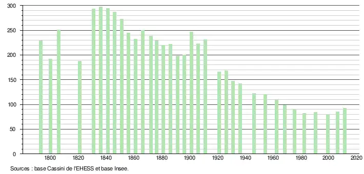 L'évolution du nombre d'habitants est connue à travers les recensements de la population effectués dans la commune depuis 1793. À partir du , les populations légales des communes sont publiées annuellement dans le cadre d'un recensement qui repose désormais sur une collecte d'information annuelle, concernant successivement tous les territoires communaux au cours d'une période de cinq ans. Pour les communes de moins de 10 000 habitants, une enquête de recensement portant sur toute la population est réalisée tous les cinq ans, les populations légales des années intermédiaires étant quant à elles estimées par interpolation ou extrapolation[48]. Pour la commune, le premier recensement exhaustif entrant dans le cadre du nouveau dispositif a été réalisé en 2006[49],[Note 5].