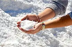 Il s'agit d'une étendue de sel sous forme de croûte dure, d'une épaisseur de 30 centimètres. On peut rouler en voiture sur sa surface.
