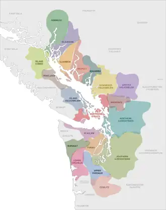 Le territoire de l'ensemble des populations salishes est situé dans le sud-ouest de la Colombie-Britannique au Canada et dans le nord de l'État de Washington aux États-Unis.
