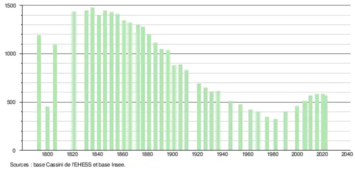 L'évolution du nombre d'habitants est connue à travers les recensements de la population effectués dans la commune depuis 1793. Pour les communes de moins de 10 000 habitants, une enquête de recensement portant sur toute la population est réalisée tous les cinq ans, les populations de référence des années intermédiaires étant quant à elles estimées par interpolation ou extrapolation[22]. Pour la commune, le premier recensement exhaustif entrant dans le cadre du nouveau dispositif a été réalisé en 2005[23].