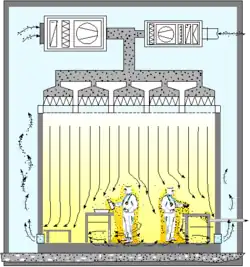 - les salles en dépression par rapport à la pression atmosphérique pour éviter que divers contaminants (virus, bactéries, spores, ...) ne puissent sortir, dans ce cas l'air vicié extrait, passe à travers un filtre à air à très haute efficacité (HEPA) ou même un filtre à très faible pénétration (ULPA) avant d'être évacué vers l'extérieur (exemple de laboratoire P4 : P4 Jean Mérieux à Lyon).