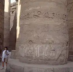 La plus connue est la grande salle hypostyle de l'enceinte d'Amon-Rê à Karnak. Elle est conçue sur un plan basilical avec une allée centrale soutenue par de hautes colonnes à chapiteaux papyriforme ouverts car cet espace reçoit la lumière du soleil par des claustras et des bas-côtés à chapiteaux fermés car restés perpétuellement dans l'ombre. Ce plan basilical est une innovation de la XIXe dynastie traduisant dans l'architecture la symbolique de la création. Ainsi la salle représentait le marécage primordial, le Noun, duquel émerge une forêt de papyrus ou de lotus stylisés par les colonnes qui sont donc à l'état végétatif dans les parties obscures de la salle et épanouies dans l'allée centrale baignée de la lumière divine.