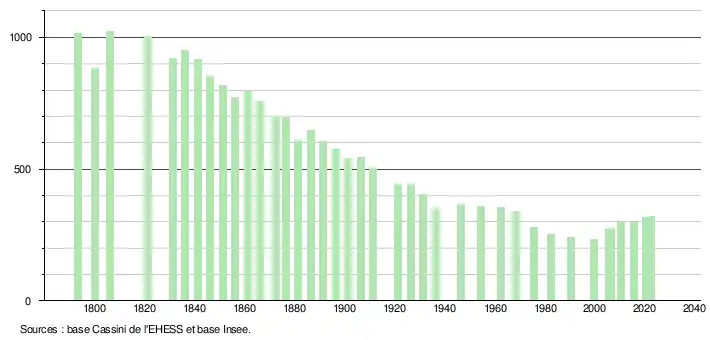 L'évolution du nombre d'habitants est connue à travers les recensements de la population effectués dans la commune depuis 1793. Pour les communes de moins de 10 000 habitants, une enquête de recensement portant sur toute la population est réalisée tous les cinq ans, les populations de référence des années intermédiaires étant quant à elles estimées par interpolation ou extrapolation[29]. Pour la commune, le premier recensement exhaustif entrant dans le cadre du nouveau dispositif a été réalisé en 2005[30].