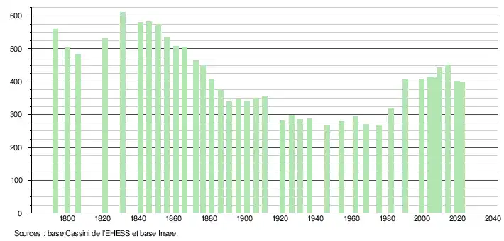 L'évolution du nombre d'habitants est connue à travers les recensements de la population effectués dans la commune depuis 1793. Pour les communes de moins de 10 000 habitants, une enquête de recensement portant sur toute la population est réalisée tous les cinq ans, les populations de référence des années intermédiaires étant quant à elles estimées par interpolation ou extrapolation[25]. Pour la commune, le premier recensement exhaustif entrant dans le cadre du nouveau dispositif a été réalisé en 2004[26].