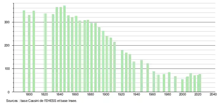 L'évolution du nombre d'habitants est connue à travers les recensements de la population effectués dans la commune depuis 1793. Pour les communes de moins de 10 000 habitants, une enquête de recensement portant sur toute la population est réalisée tous les cinq ans, les populations de référence des années intermédiaires étant quant à elles estimées par interpolation ou extrapolation[47]. Pour la commune, le premier recensement exhaustif entrant dans le cadre du nouveau dispositif a été réalisé en 2005[48].