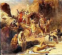 - Prise de Constantinople. — . Par Eugène Delacroix en 1840. — H. 4,06. — L. 4,92. Baudouin, comte de Flandre, commande les Français qui avaient donné l'assaut du côté de la terre, et le vieux doge Dandolo, à la tête des Vénitiens et sur ses vaisseaux, avait attaqué le port. Les principaux chefs parcourent les divers quartiers de la ville, et les familles éplorées viennent sur leur passage invoquer leur clémence.