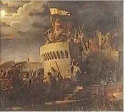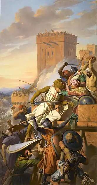 - Prise de Damiette. —1219. Par Henri Delaborde en 1839. — H. 0,70. — L. 0,79. Les Croisés, commandés par Jean de Brienne, vont mettre le siège devant Damiette, vers la fin du mois de mai de l'année 1218. Ce siège ne dure pas moins de dix-huit mois ; enfin dans les premiers jours de novembre de l'année suivante, un dernier assaut livre la ville aux assiégeants.